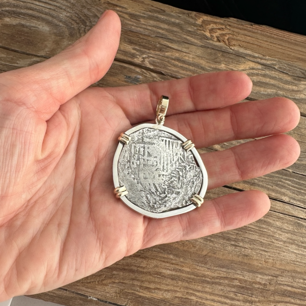 Authentic Atocha Grade 2, 8 Reales in Sterling Silver Setting with 14K Gold Prongs