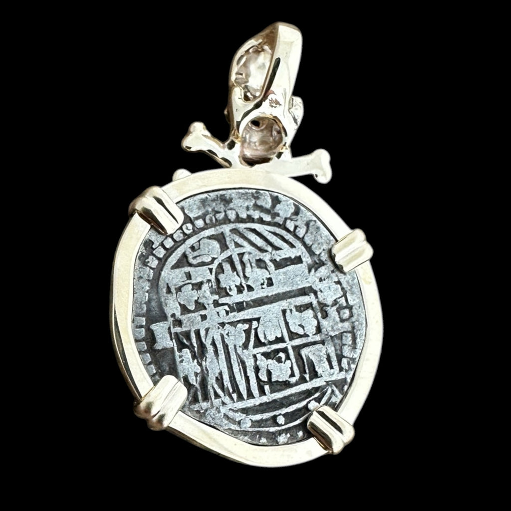 Coinage of this historical period has fascinated experts as well as novices. These pieces were struck from dies and cut to weight according to the Spanish monetary system. They were called "macuquinas" in Spanish but are known to us as "cobs". Minted in five denominations in silver, the largest was the eight reales, famous in the colonies and among pirates as a "piece of eight". The other denominations were four reales, two reales, one reale and half reale. COB1-DLC-SK21B