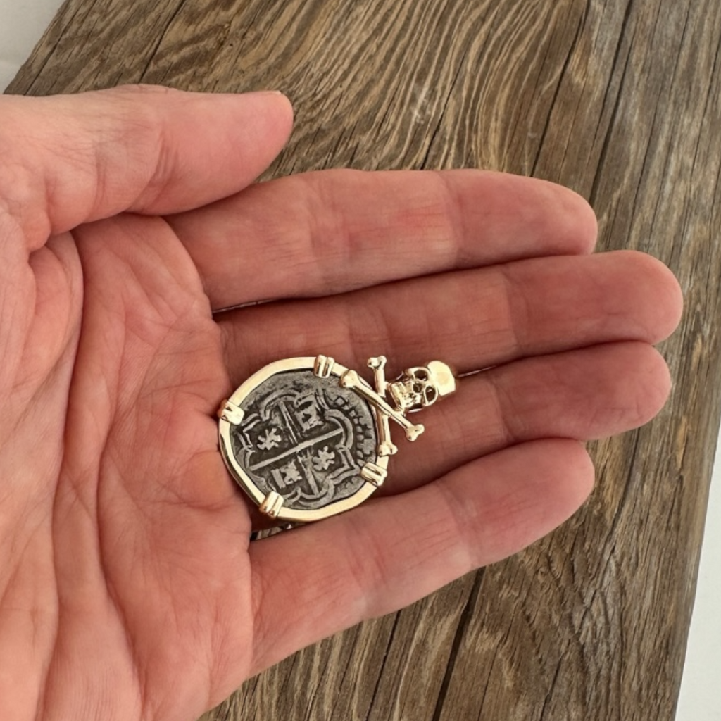 Authentic Land Cob set in 14K Gold Mount with Skull and Crossbones