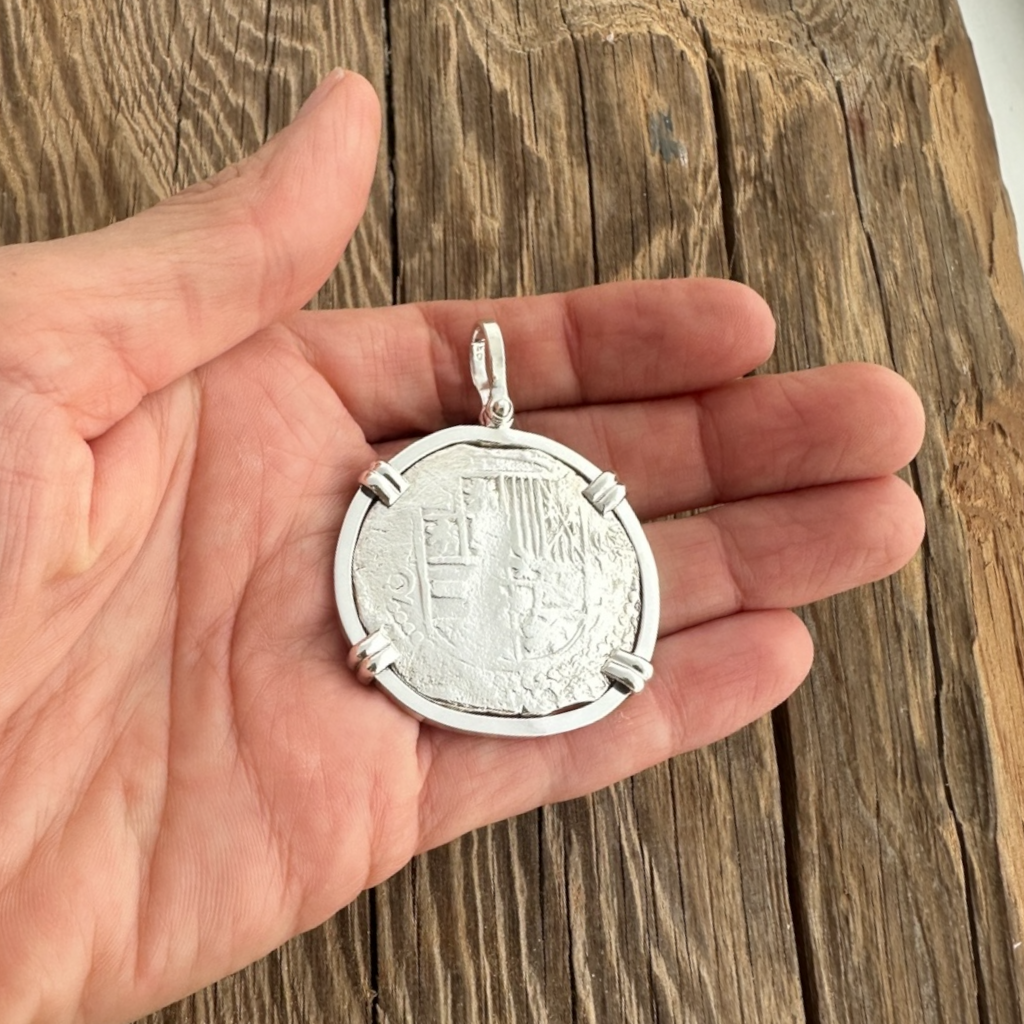 The Nuestra Senora de Atocha carried over 200,000 hand stamped silver coins from mints in Potosi, Lima and Mexico City. Silver coins are referred to as “pieces of eight” and were measured in reales. Their denominations are 8 reales, 4 reales, 2 reales, 1 real, ½ real and ¼ real. An 8 reales silver Atocha coin was roughly equivalent to one month’s pay for a sailor in the 1600’s. Due to the crude hand-struck minting process, no two coins look alike.
