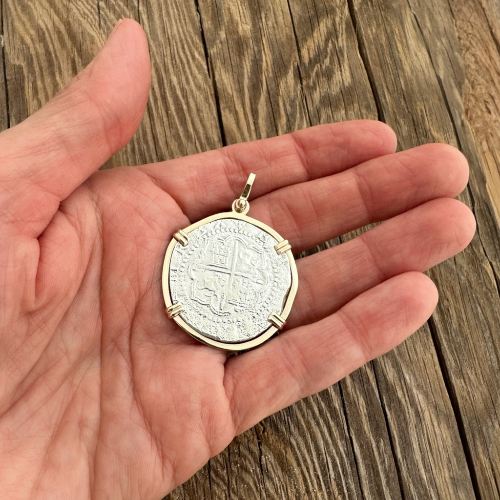 Museum Quality Re-Creations made with 100% Atocha Silver from silver bar #85A-S948 recovered from the motherload of the Spanish shipwreck, Nuestra Senora de Atocha in July of 1985. This silver bar is from the private collection of Mel Fisher’s daughter, Taffi Fisher. These re-creation coins were cast from the Fisher Family Coin Collection.